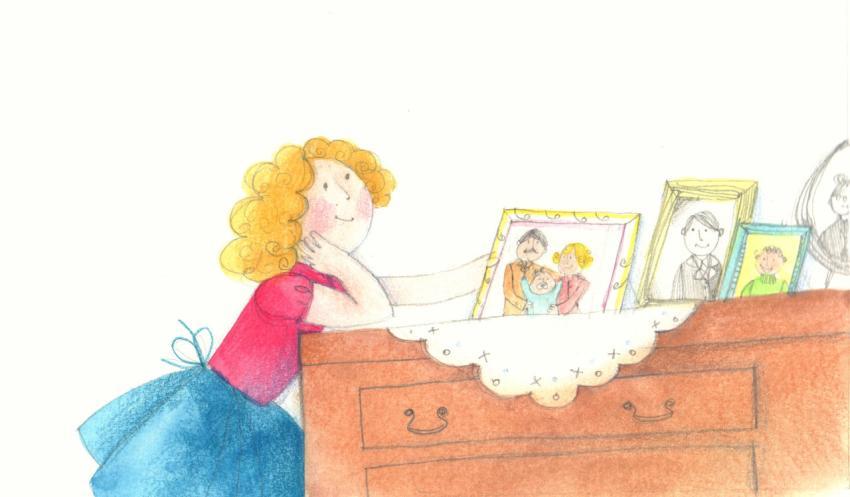 illustration in watercolor and crayons of a girl looking at family photos