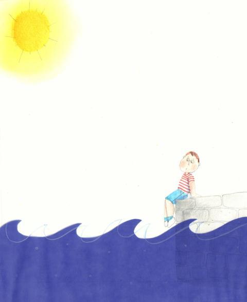 illustration in collage, watercolor and crayons of boy sitting by the sea