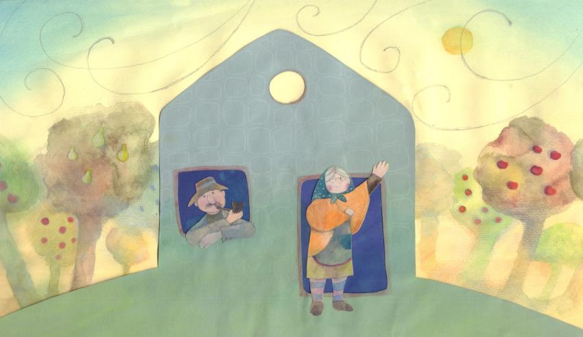 illustration in collage, watercolor and crayons of grandparents` house in a village