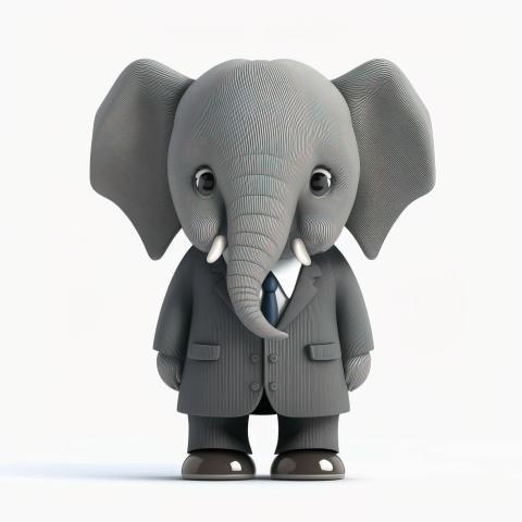 This cartoon elephant is dressed to impress in a stylish boss suit, complete with a crisp white shirt, sharp tie, and sleek black shoes. With a confident stance and a charming smile, he exudes an air of authority and power. Against a simple white background, the elephant takes center stage, commanding attention with his commanding presence