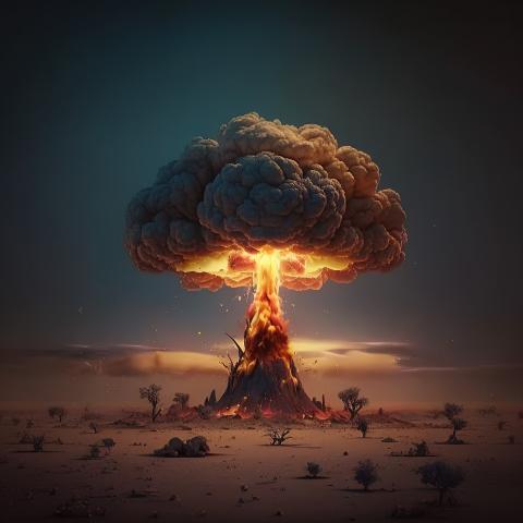 The intense energy of the nuclear explosion illuminates the sky, casting a blinding light over the entire scene. The shockwave rips through the air, sending debris and dust flying in every direction. The force of the blast is so strong that it creates a massive mushroom cloud that towers over the landscape, its ominous shape a stark reminder of the destructive power of humanity's most devastating weapon. Despite the chaos and destruction, there is a strange beauty to the scene, as the colors of the explosion blend together in a fiery display that is both captivating and terrifying. This image captures the horror and awe-inspiring power of a nuclear explosion, reminding us of the terrible consequences of using such weapons.
