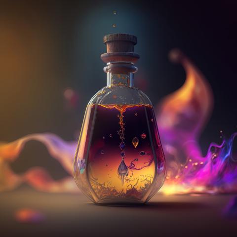 This fantastic illustration features a bubble or flask reminiscent of a magical potion bottle, sealed with a cork on top. Inside, there's a mysterious liquid with something indiscernible floating at the bottom. The background is a beautiful, colorful blur