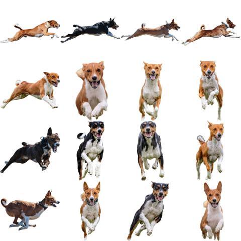 Basenji dog collage running catching hunting straight on camera isolated on white background at full speed on competition
