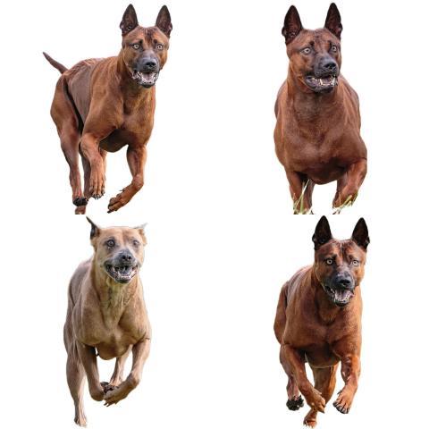Thai Ridgeback dog collage running catching hunting straight on camera isolated on white background at full speed on competition
