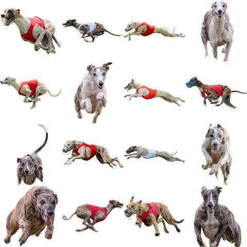 Whippet sprinter dog collage running catching hunting straight on camera isolated on white background at full speed on competition