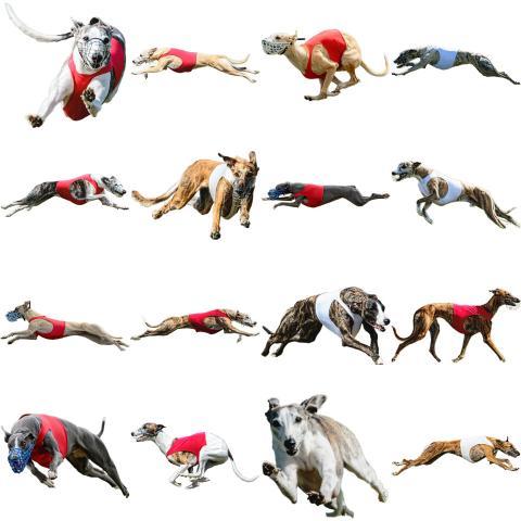 Whippet sprinter dog collage running catching hunting straight on camera isolated on white background at full speed on competition