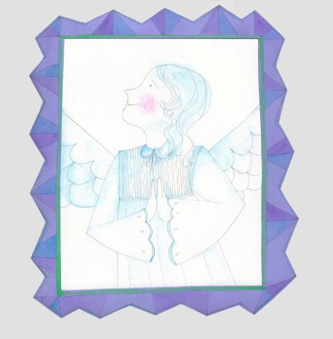 illustration in collage, crayons and watercolor of an angel in picture frame