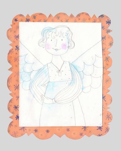 illustration in collage, watercolor and crayons of an angel in a picture frame