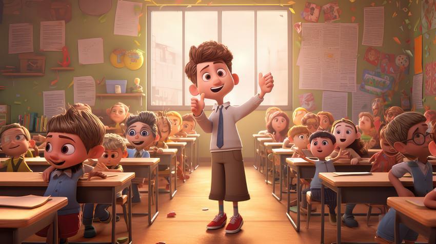 Back to school theme picture, photo of students and teacher in the classroom very happy