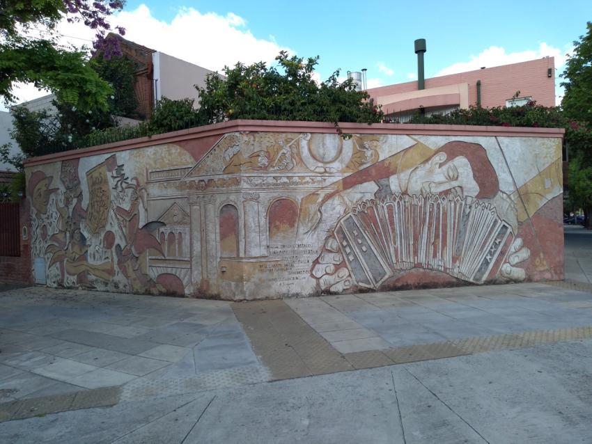 An almost 3d mural -made in relief- in "Villa Urquiza's" town, with tango and murga from Buenos Aires to the world
