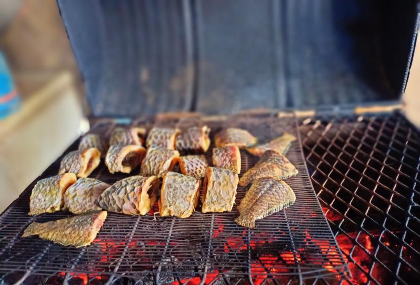 Grill with smoke on a pink background with four sausages. 3D illustration, 3D rendering