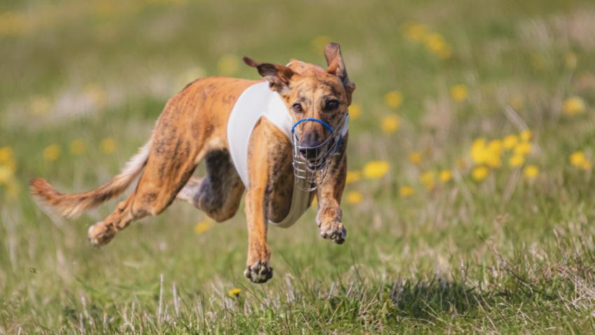 Dog running in green field and chasing lure at full speed on coursing competition straight into camera