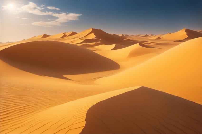Immerse yourself in the tranquility of a vast desert landscape beneath a clear azure sky. This captivating image encapsulates the peaceful beauty of an arid desert, where the blue sky contrasts with the warm tones of the sands below, creating a serene and captivating scene.