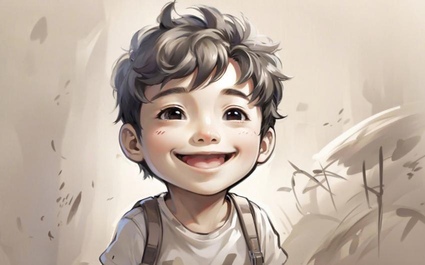 The character's round, oversized head with sparkling, expressive eyes and a broad, infectious smile instantly draws the viewer's attention. His eyes radiate a sense of wonder and enthusiasm, while the rosy blush on his cheeks conveys a warmth and genuine happiness that is truly heartwarming.