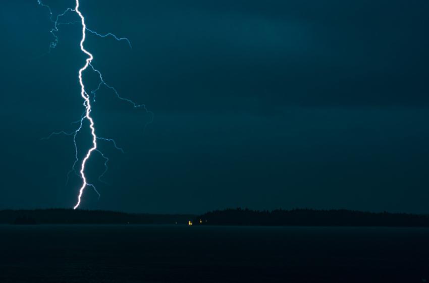 lightning strikes the sky over a body of water