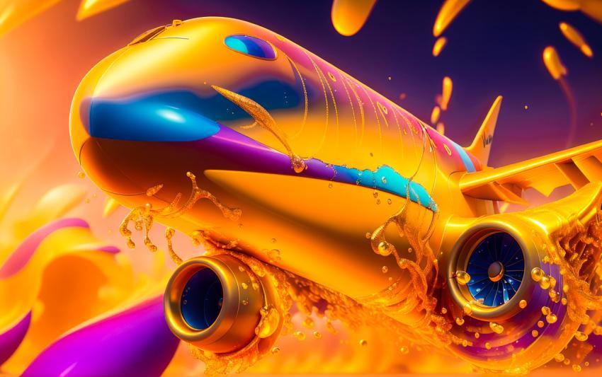 Take a visual trip through this striking image that combines artistic abstraction with the essence of flight. An aircraft takes center stage in this engrossing depiction, each detail painstakingly rendered against a canvas of vibrant colors. Power and grace are combined in the way the golden body waves gently entwine with the aircraft. Shiny bursts of light draw attention to the dynamic shapes and evoke a sense of never-ending motion. The depth of field enhances the cinematic effect by engrossing the audience in the minute details of this aerial performance. This composition, which celebrates the excitement and beauty of aviation through the lens of abstract art, is a harmonious fusion of technical precision and visual poetry.