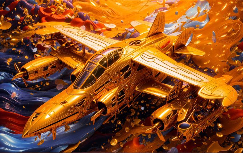 Take a visual trip through this striking image that combines artistic abstraction with the essence of flight. An aircraft takes center stage in this engrossing depiction, each detail painstakingly rendered against a canvas of vibrant colors. Power and grace are combined in the way the golden body waves gently entwine with the aircraft. Shiny bursts of light draw attention to the dynamic shapes and evoke a sense of never-ending motion. The depth of field enhances the cinematic effect by engrossing the audience in the minute details of this aerial performance. This composition, which celebrates the excitement and beauty of aviation through the lens of abstract art, is a harmonious fusion of technical precision and visual poetry.