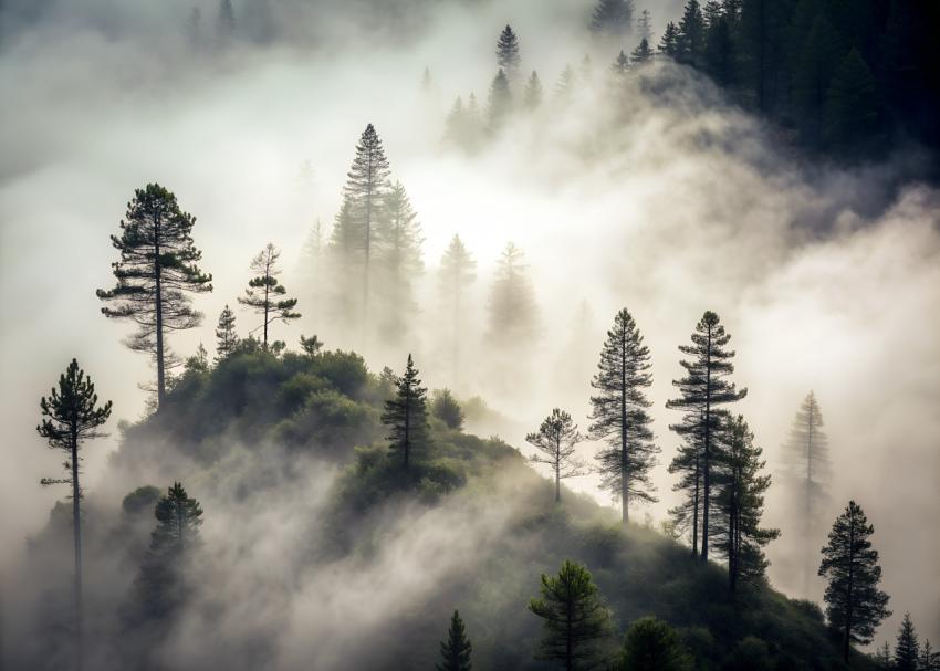 tops of a pine forest in the fog