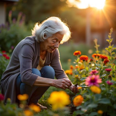 Golden Years in Bloom: Elderly Gardener at Sunset