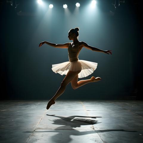 A breathtaking image of a ballerina mid-leap on stage, capturing perfect form and grace. Dramatic stage lights create captivating shadows, while the dancer is frozen in time by a professional-grade mirrorless camera. Shot with a 70-200mm telephoto lens using high frame rate burst mode, this photograph encapsulates the pinnacle of ballet performance.