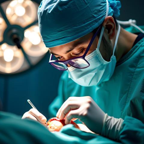 A high-detail image capturing a surgeon performing a delicate operation. Intense concentration is visible in the surgeon's eyes above the surgical mask, while overhead surgical lights provide focused illumination. This photograph, taken with a specialized medical photography setup, offers extreme detail and clarity, showcasing the precision and pressure of modern surgery.