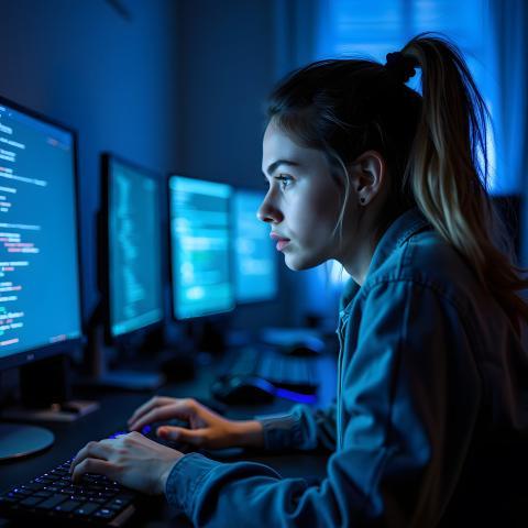 A compelling portrait of a young woman intensely focused on coding, surrounded by multiple screens in a dimly lit room. The blue light from the monitors reflects off her concentrated face, captured beautifully with a full-frame camera at high ISO. The shallow depth of field emphasizes her eyes and the nearest screen, highlighting her immersion in the digital world.