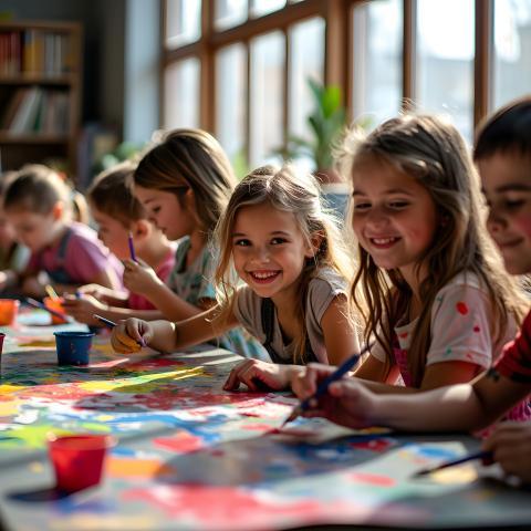 A vibrant scene showcasing a diverse group of elementary school children working together on a colorful mural. Their clothes are splattered with paint and their faces beam with big smiles. Captured with a versatile 24-70mm zoom lens, the image is illuminated by natural light streaming through large windows, emphasizing the joy of creative collaboration.