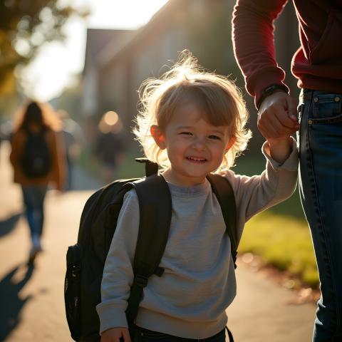 A touching moment capturing a child's first day of school. Mixed emotions play across the young face – excitement mingled with apprehension. An oversized backpack emphasizes the child's small stature, while a parent's hand letting go symbolizes the start of a new chapter. Morning sunlight creates long shadows, adding depth to this milestone moment captured with a 50mm lens for a classic photojournalistic feel.