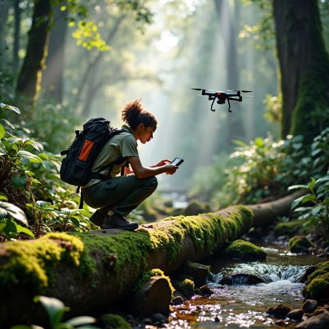 This captivating image bridges the gap between advanced technology and pristine nature. A young environmental scientist is shown using cutting-edge tools to study a verdant rainforest ecosystem. The photograph powerfully illustrates the role of modern science in understanding and preserving our natural world, highlighting the dedication of a new generation of researchers in the face of environmental challenges.