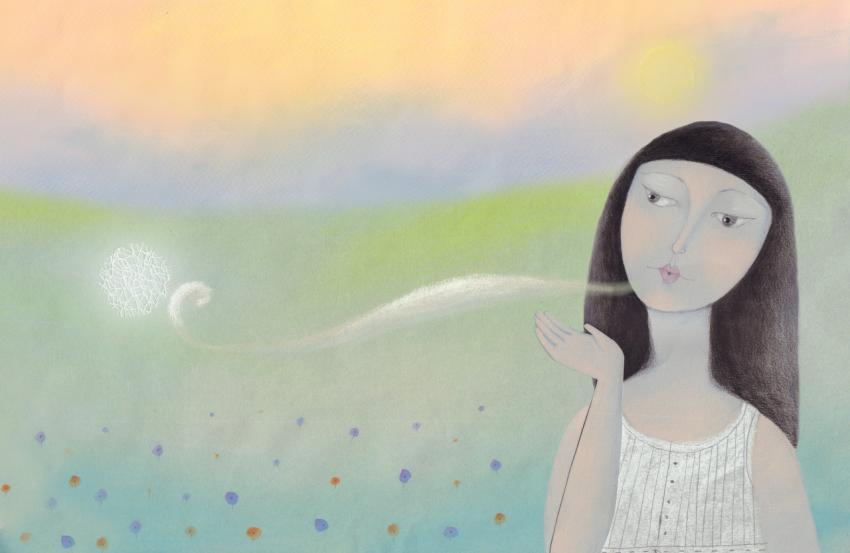 illustration in watercolor, crayons and collage of a woman blowing a snowflake