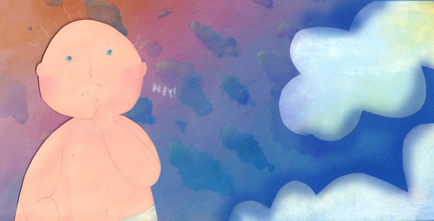 illustration in watercolor, crayons and collage of a baby saying: hey