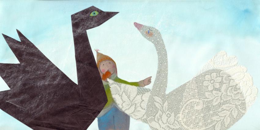 illustration in watercolor, crayons and collage of boy and black and white swan