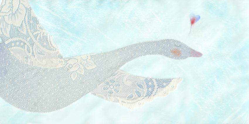 illustration in watercolor, crayons and collage of a white swan weeping