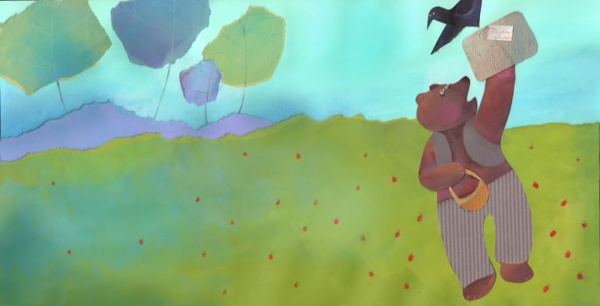 illustration in watercolor, crayons and collage of the bear with a package and the crow