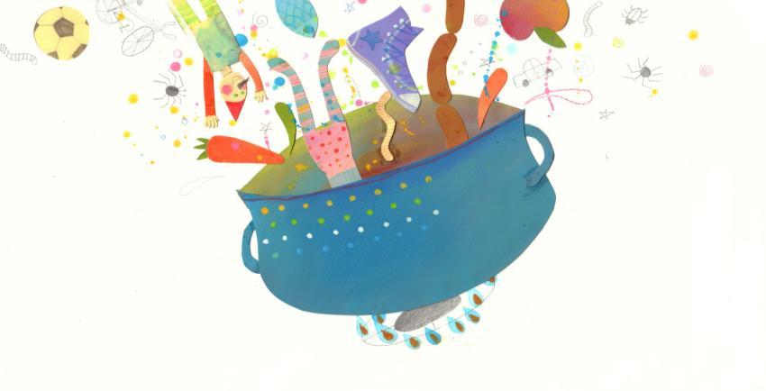 illustration in watercolor, crayons and collage of the pot full of everything