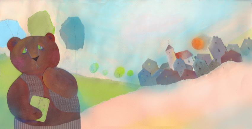 illustration in watercolor, crayons and collage of the bear and the village in distance