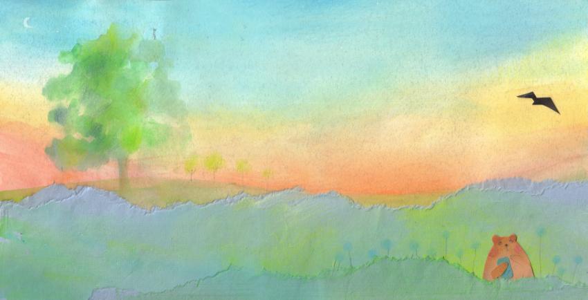 illustration in watercolor, crayons and collage of the dormouse and crow in the summer sunset