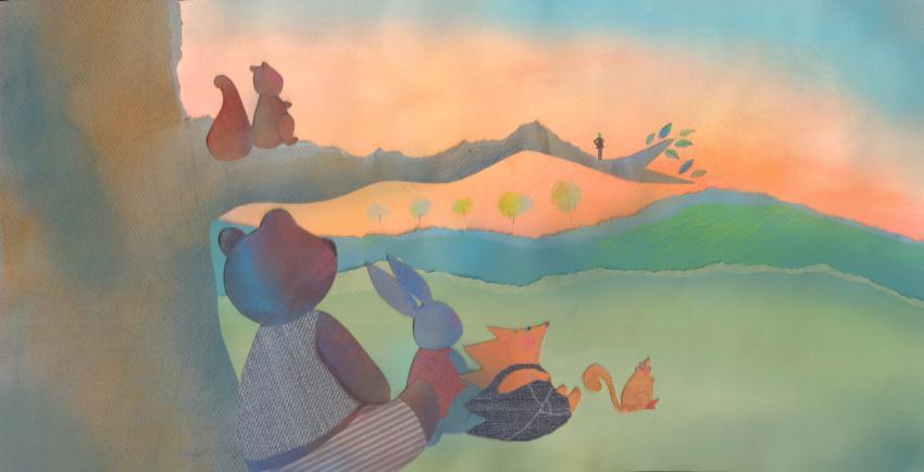 illustration in watercolor, crayons and collage of the forest animals watching sunset