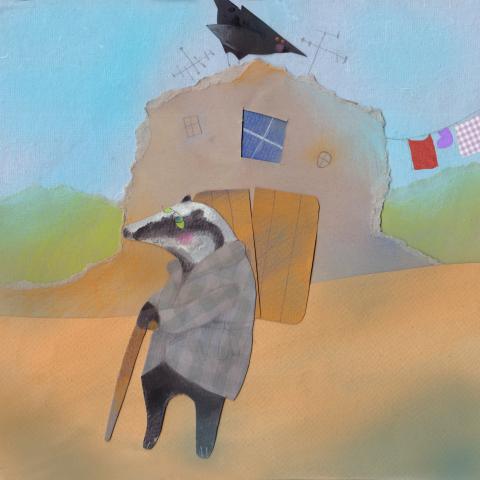 illustration in watercolor, crayons and collage of the old badger in front of the house