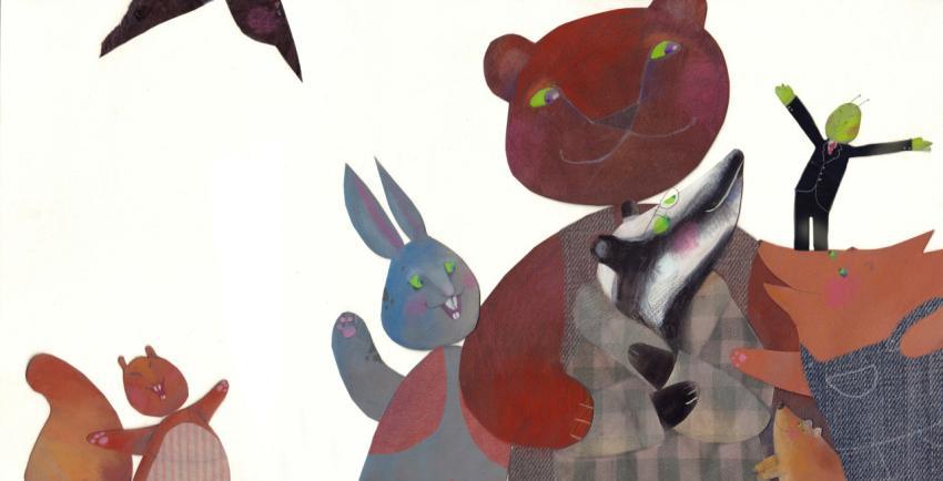 illustration in watercolor, crayons and collage of the forest animals hugging