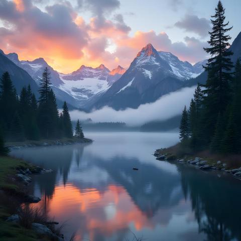 A breathtaking view of a tranquil mountain lake at sunrise, surrounded by lush pine forests and majestic peaks. Ideal for travel blogs, nature enthusiasts, and relaxation themes.