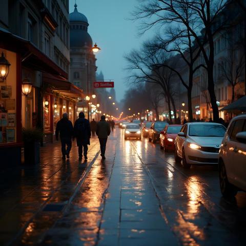 Dynamic photo of a busy city street at dusk, with glowing shop windows and wet pavement reflecting lights. Perfect for urban lifestyle and travel themes.