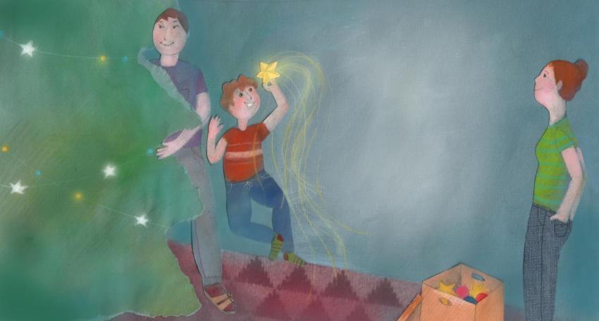 illustration in watercolor, crayons and collage of a family decorating a Christmas tree