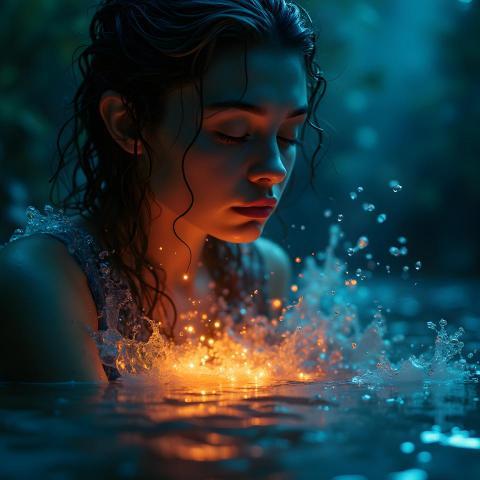 A mesmerizing photo of a beautiful woman in water, illuminated by soft light emanating from beneath the surface. Splashes surround her as she gazes thoughtfully at the shimmering droplets, creating a dreamy and poetic atmosphere. Perfect for artistic, fashion, and inspirational photography