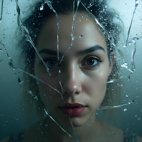 An evocative photograph of a woman gazing solemnly into the camera, framed by shards of broken glass and dynamic water splashes. Her expression conveys depth and vulnerability, with the fractured elements symbolizing broken emotions and resilience. Ideal for conceptual, artistic, and emotional storytelling projects