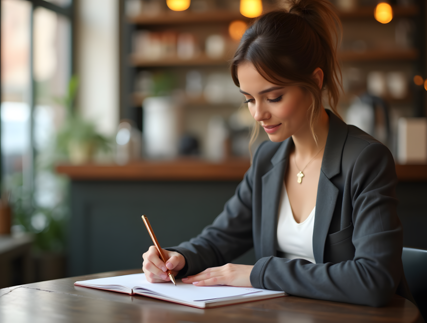 A female entrepreneur in a business casual outfit writing in a planner at a cozy cafe. The image captures a moment of focus and productivity in a relaxed yet professional setting.