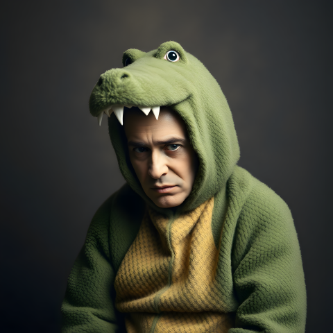 A middle-aged man sits solemnly in a green dinosaur costume with a hood resembling a cartoonish reptile face. The studio background and soft lighting highlight his thoughtful and serious expression, creating a humorous contrast.