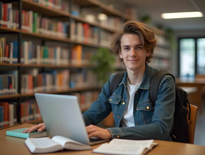 A young adult student in casual attire studying in a library, using a laptop and surrounded by books. The student appears focused and immersed in their studies, reflecting an academic and productive environment.