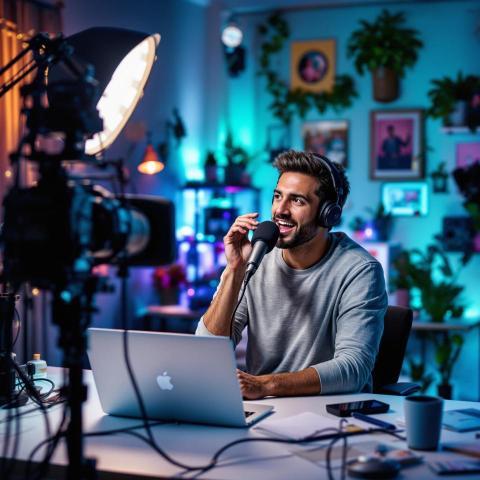 A dynamic shot of a YouTube creator recording a video in a professional studio setup, showcasing creativity and passion.