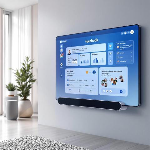 A futuristic Facebook-powered smart home dashboard displayed on a sleek digital screen, featuring controls for communication, smart devices, and social networking.